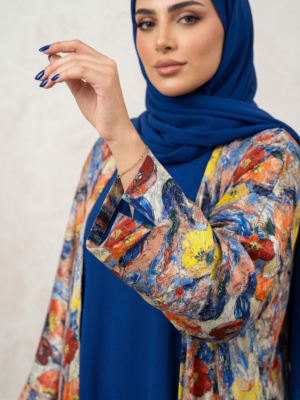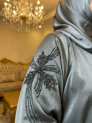 القماش: صُممت من قماش “الستان الواقف اللامع”؛ خامة استثنائية تمنح العباية قصة ثابتة ومرتبة على الجسم، وتتميز بلمعة غنية وجذابة تعكس الضوء برقي لتبرز فخامة إطلالتكِ.