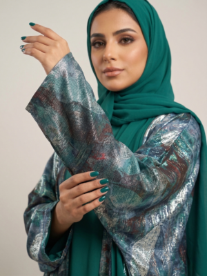 القماش: مصنوعة من قماش “ندى” عالي الجودة والناعم؛ والذي يُعرف بسواده الفاحم، وملمسه البارد والانسيابي على الجسم، كما أنه عملي جداً ومقاوم للتجعد.