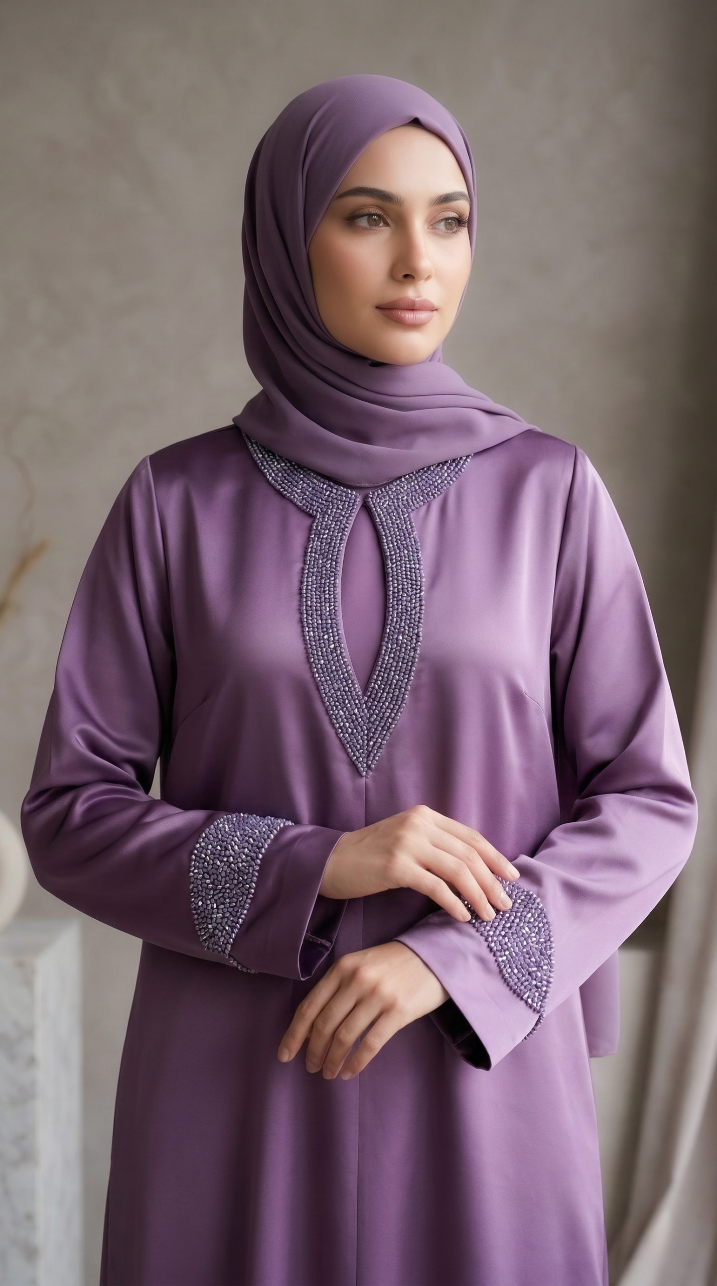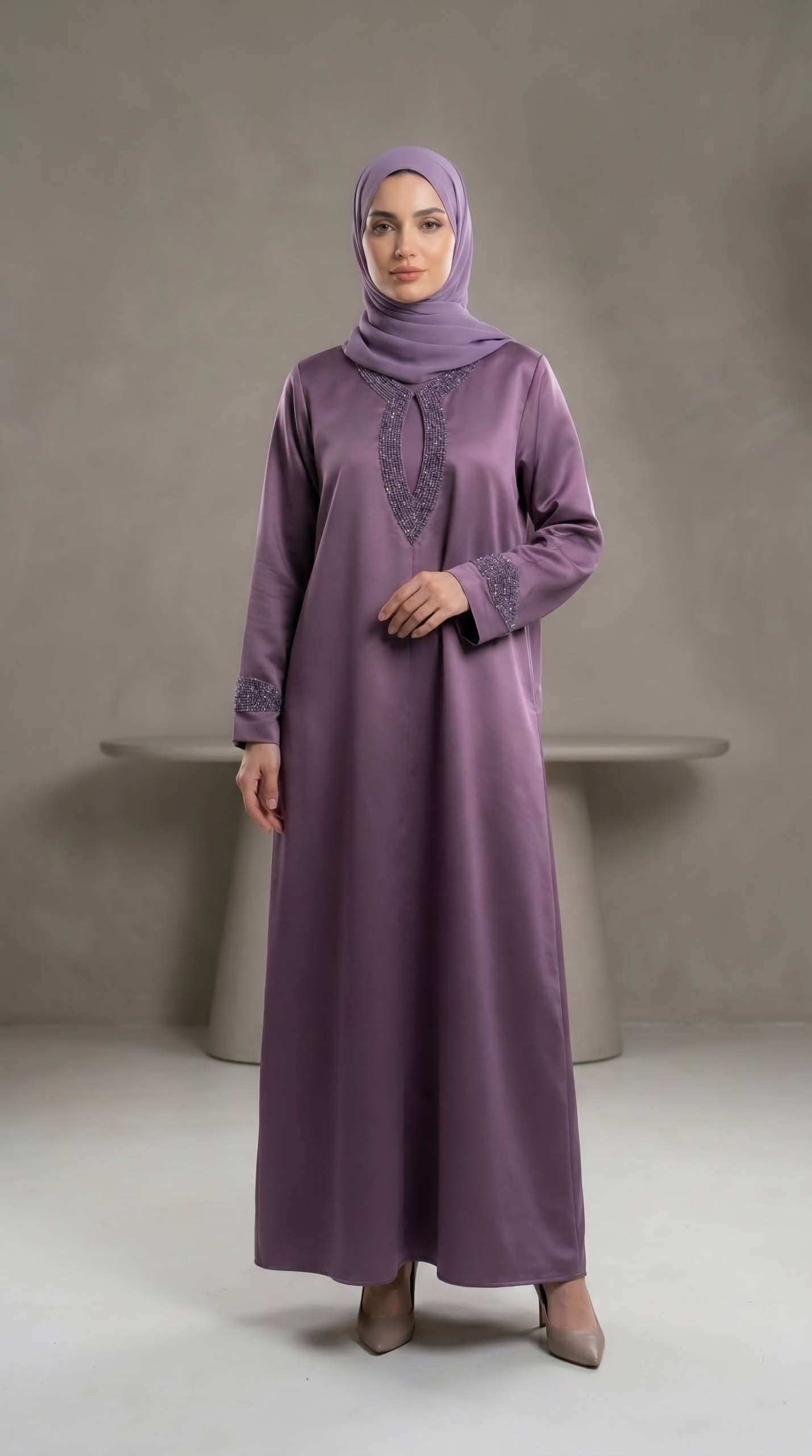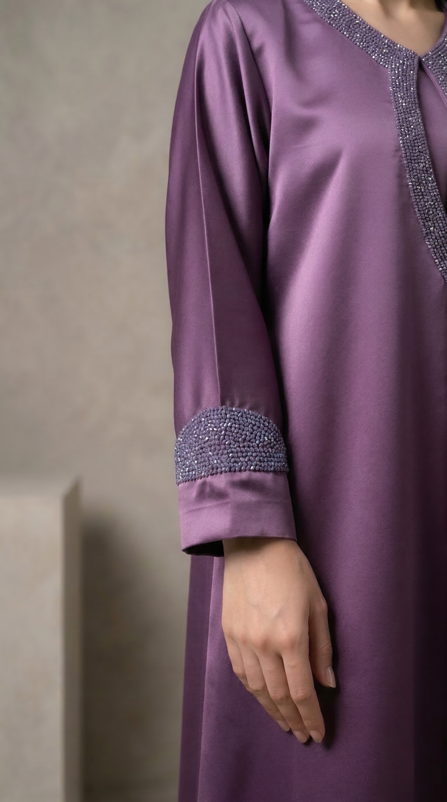 التطريز (شغل هاند ميد): تتألق العباية بتطريز “السمبوسة” اليدوي الدقيق والأصيل، والذي يزين منطقة الصدر وأساور الأكمام بحرفية عالية، ليضفي لمسة تراثية فاخرة تتناغم بروعة مع حداثة اللون اللافندر ولمعان الستان.