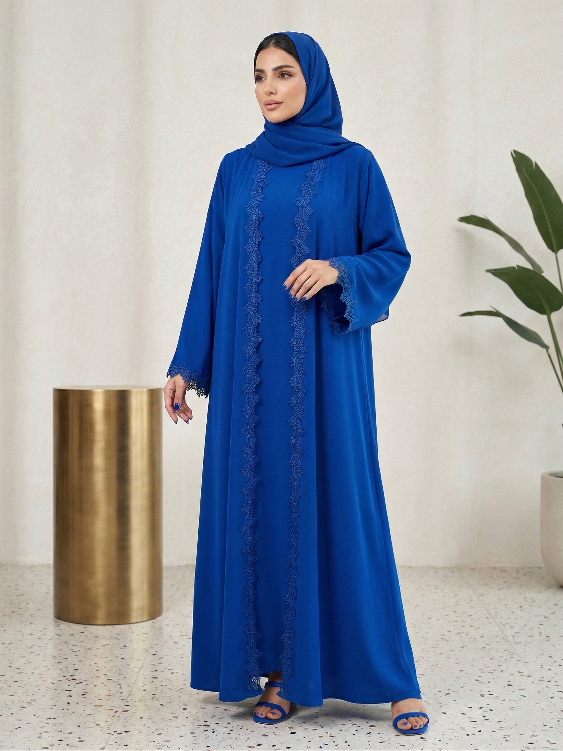أضيفي لمسة من الفخامة الملكية إلى خزانة ملابسك مع هذه العباية المميزة بلونها الأزرق النيلي الساحر. صُممت هذه القطعة بعناية فائقة لتجمع بين الحشمة والأناقة العصرية، مما يجعلها الخيار المثالي للمناسبات الخاصة والإطلالات الراقية.