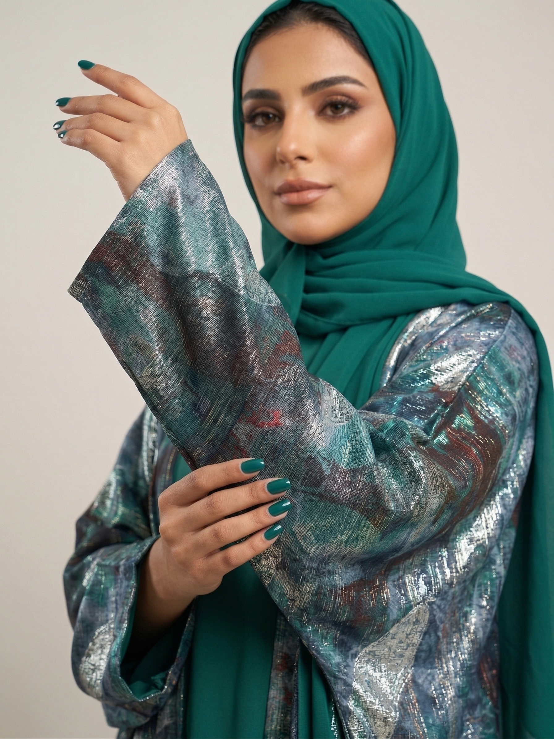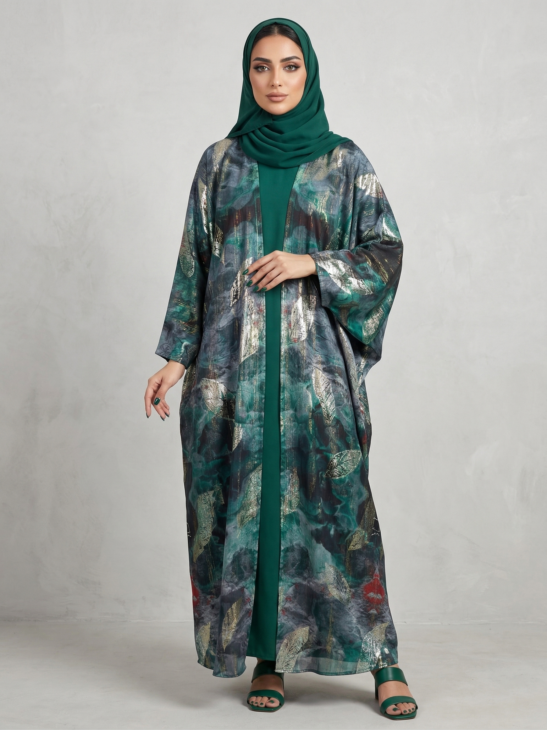 تجمع هذه العباية بين خفة قماش الأورجانزا الفاخر وفخامة التصميم، لتمنحكِ حضوراً لافتاً في أرقى المناسبات. تتميز العباية بنسيج متداخل الألوان يمزج بين درجات الأخضر العميق والرمادي الدخاني، مع لمسات فنية من نقوش أوراق الشجر الذهبية التي تضفي لمعاناً ساحراً مع كل حركة.