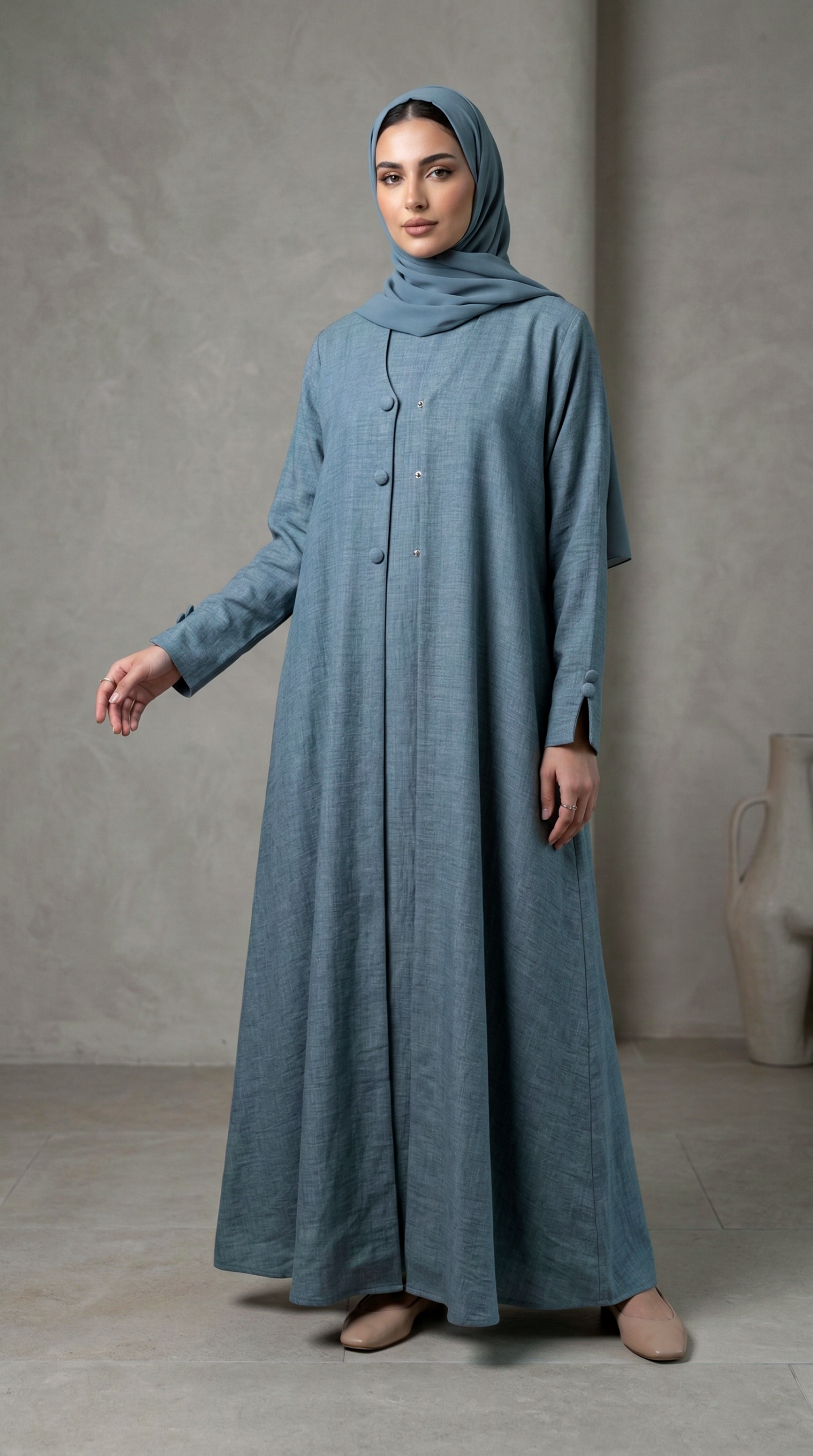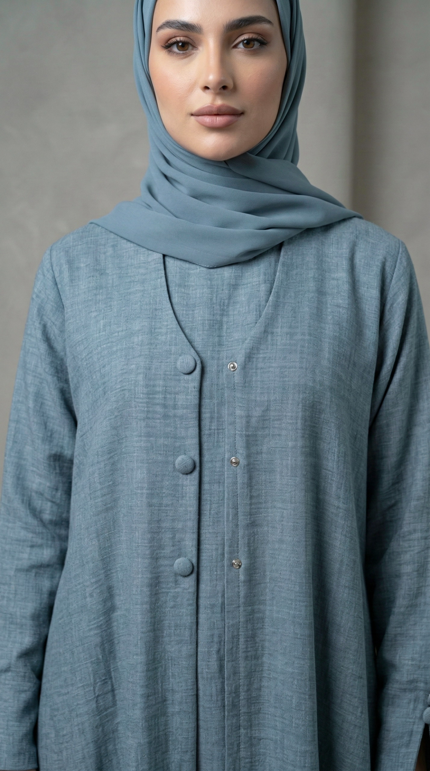 • العباية: قصة انسيابية مريحة مزينة بأزرار أمامية وتفاصيل أزرار ناعمة على الأكمام تضفي طابعاً عملياً وأنيقاً.