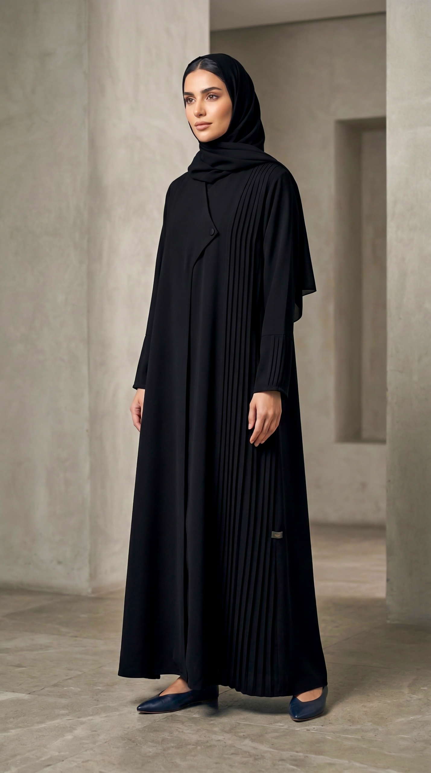 • التصميم: تتميز بقصة غير متماثلة تخطف الأنظار، مع تفاصيل الطيات (البليسيه) الطولية المتقنة على جانب واحد، مما يضفي حركة وانسيابية رائعة مع كل خطوة، بالإضافة إلى ياقة مطوية أنيقة تغلق بزر أمامي.