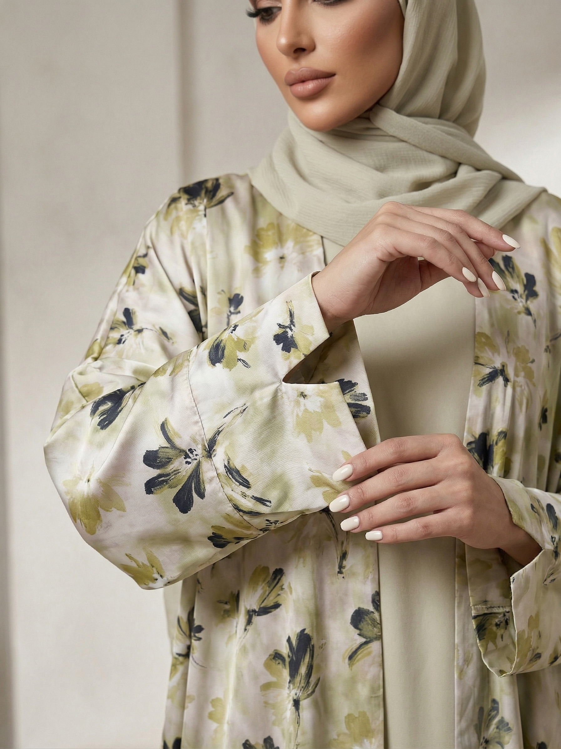 تتميز هذه العباية بنقشات الزهور المائية المنسدلة بنعومة على قماش الحرير بلونه الأخضر الفاتح (Mint Green)، مما يمنحكِ إطلالة مفعمة بالأنوثة والحيوية. تصميمها الانسيابي والواسع يجعلها القطعة الأنسب للمرأة التي تبحث عن الفخامة والراحة في آن واحد، لتكوني دائماً متألقة في أرقى تجمعاتكِ.