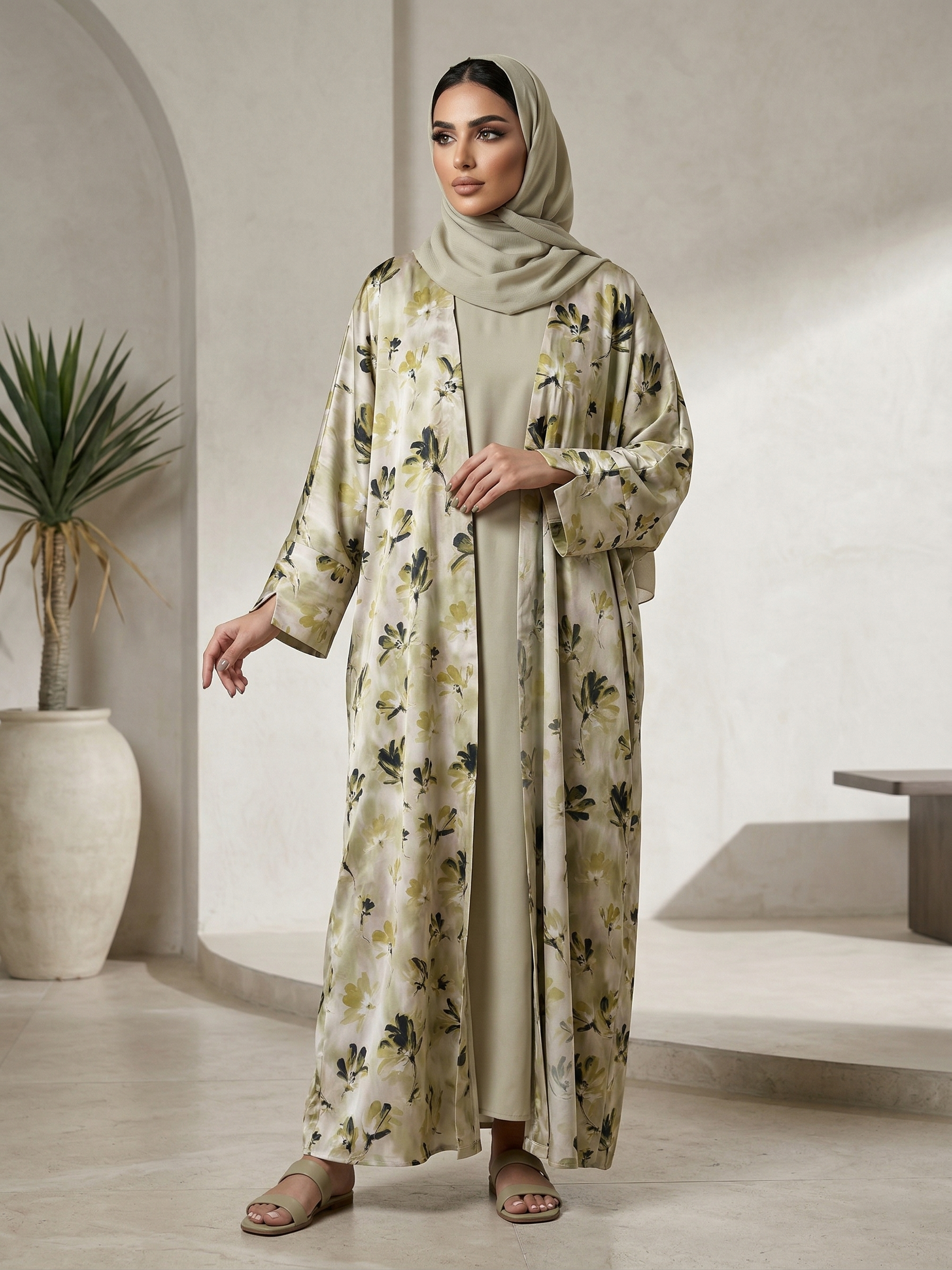 التصميم: طقم راقي مكون من قطعتين (عباية مفتوحة بنقوش ورد + فستان داخلي سادة بلون أخضر هادئ متطابق).