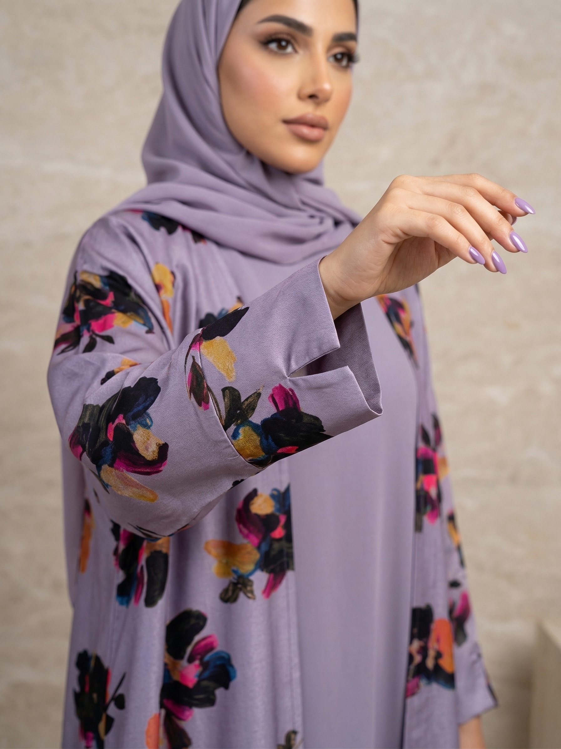 تتميز هذه العباية بتصميمها الراقي الذي يجمع بين هدوء اللون البنفسجي الفاتح وجمال نقشات الزهور الملونة الموزعة بأسلوب فني جذاب. صُممت خصيصاً لتمنحكِ إطلالة مشرقة ومريحة في آن واحد، حيث يوفر قماش القطن الطبيعي البرودة والنعومة التي تحتاجينها طوال اليوم.