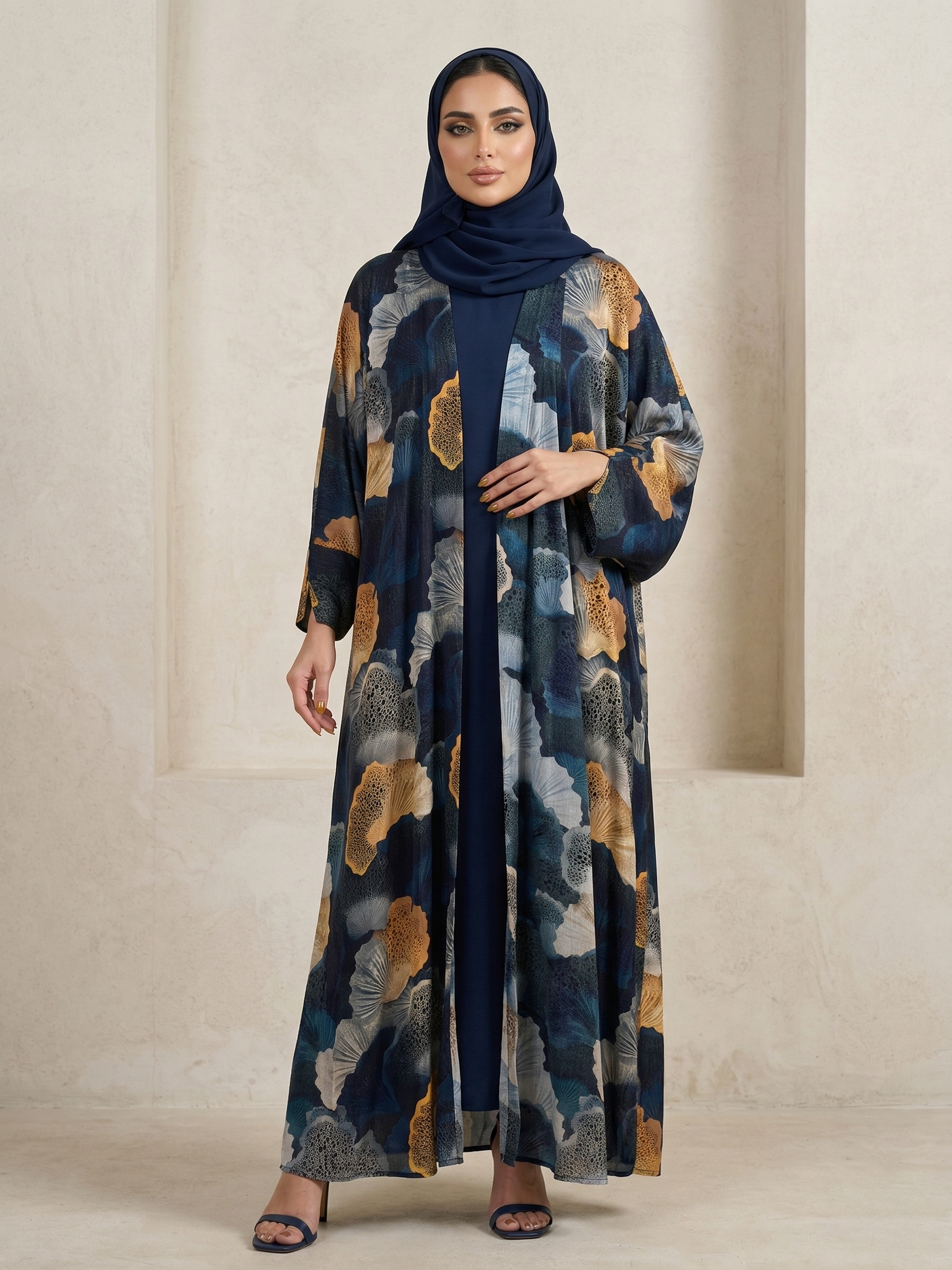 تتميز العباية بنقشات واسعة تشبه أوراق الشجر أو الأصداف بألوانها الدافئة، مما يجعلها قطعة فنية تخطف الأنظار في كل مكان. صُممت من قماش القطن عالي الجودة لتوفر لكِ الراحة والانتعاش طوال اليوم، مع الحفاظ على مظهركِ الأنيق والمحتشم. التصميم يأتي بلمسة عصرية تناسب المرأة التي تبحث عن التميز والراحة في آن واحد.
