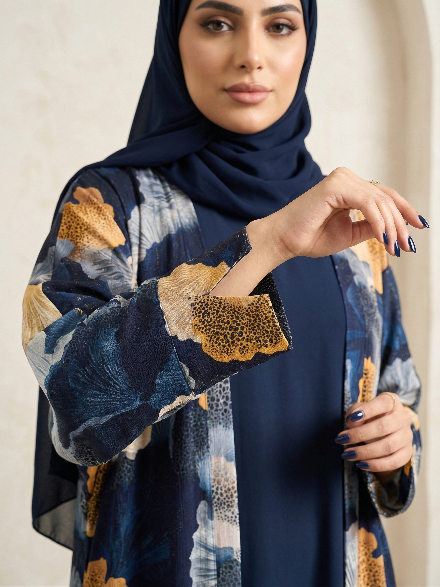استمتعي بأناقة لا حدود لها مع عباية “ليالي المحيط”، التي تجمع بين فخامة اللون الكحلي وجاذبية النقوش الفنية المتميزة.