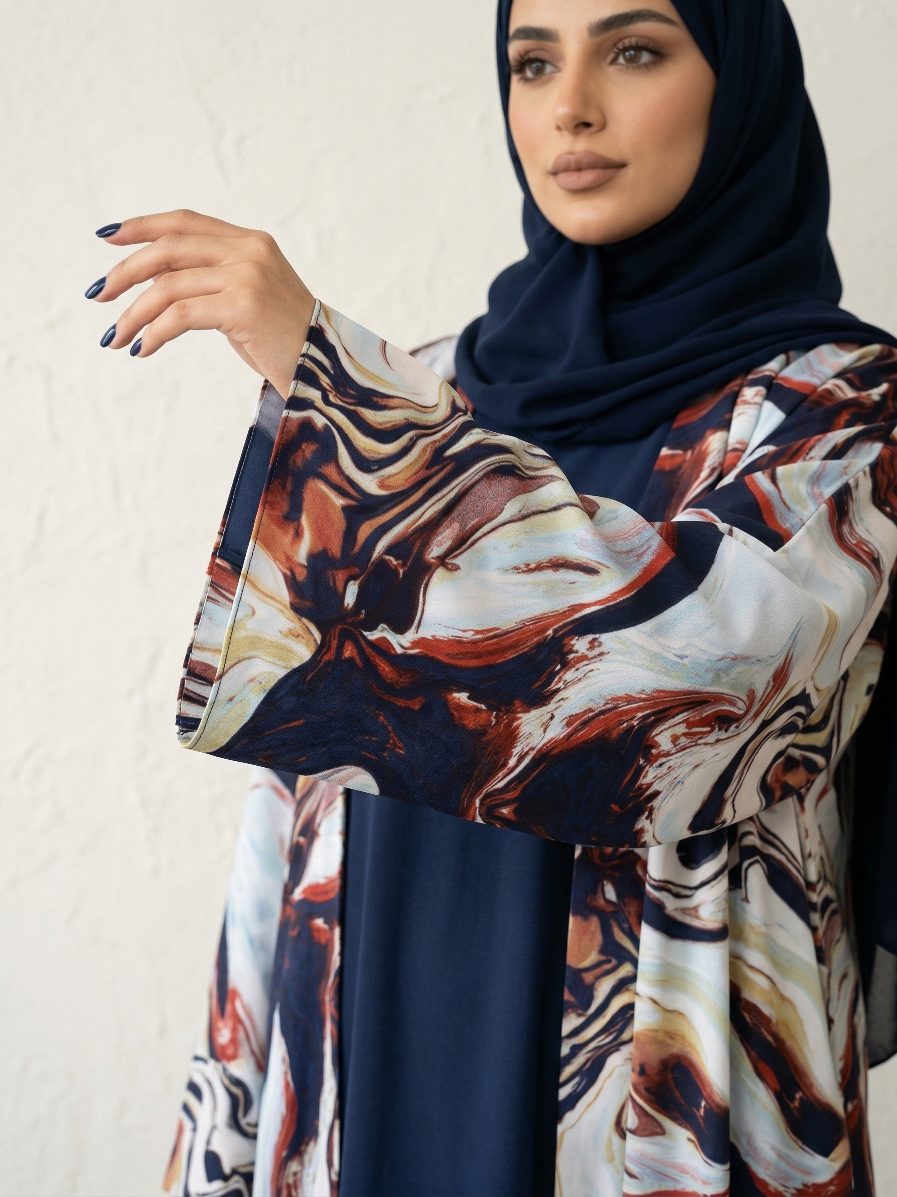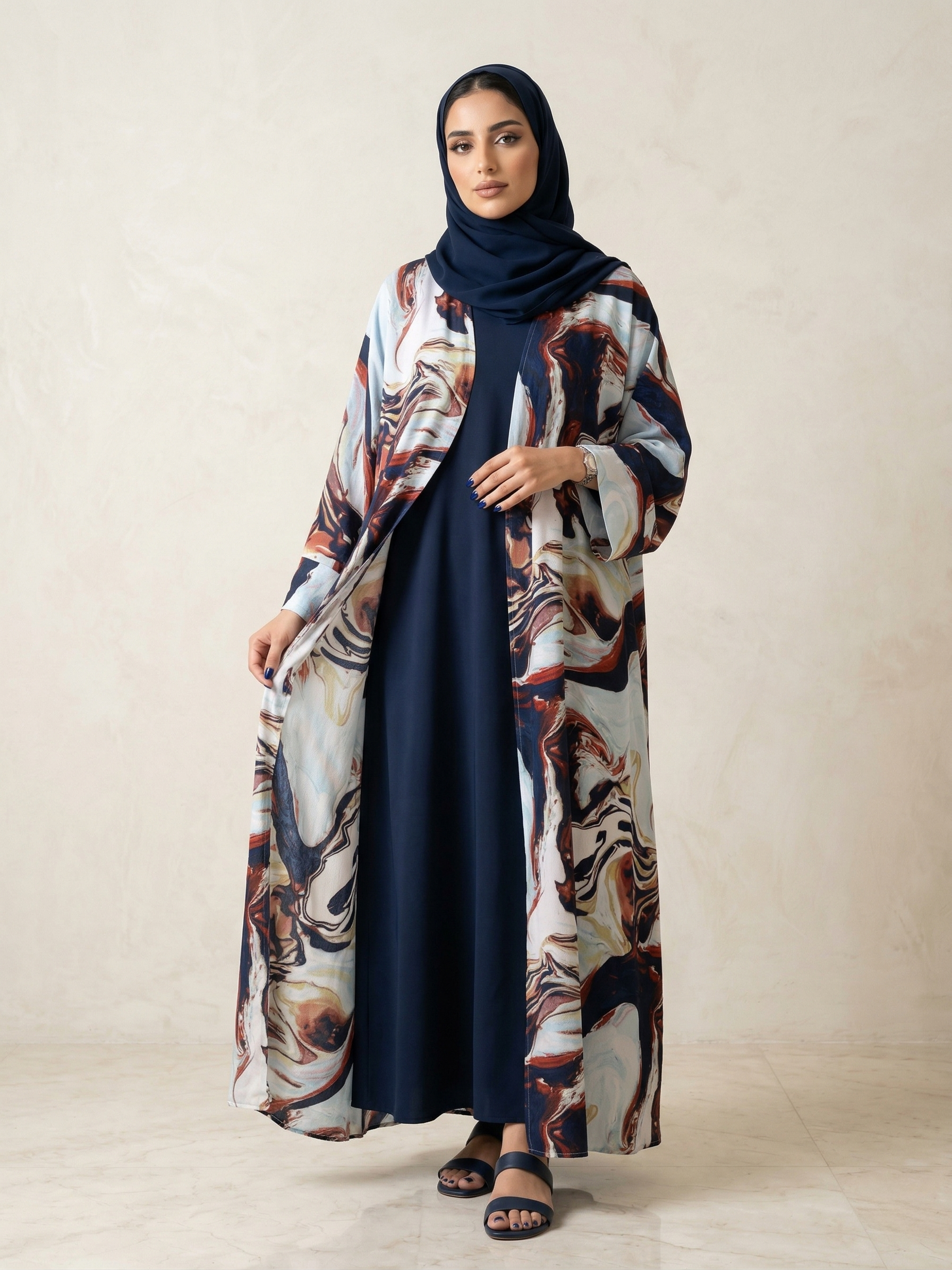 تتميز هذه العباية بنقشات رخامية (Marble) انسيابية تمزج بين درجات الكحلي، البني الدافئ، والبيج الكريمي، مما يعطي انطباعاً بالفخامة والتميز. التصميم مكون من قطعتين متناسقتين يبرزان جمال اللون الكحلي الملكي، ليوفر لكِ مظهراً متكاملاً يجمع بين العصرية والحشمة، وهو مثالي جداً للاستخدام اليومي الراقي.