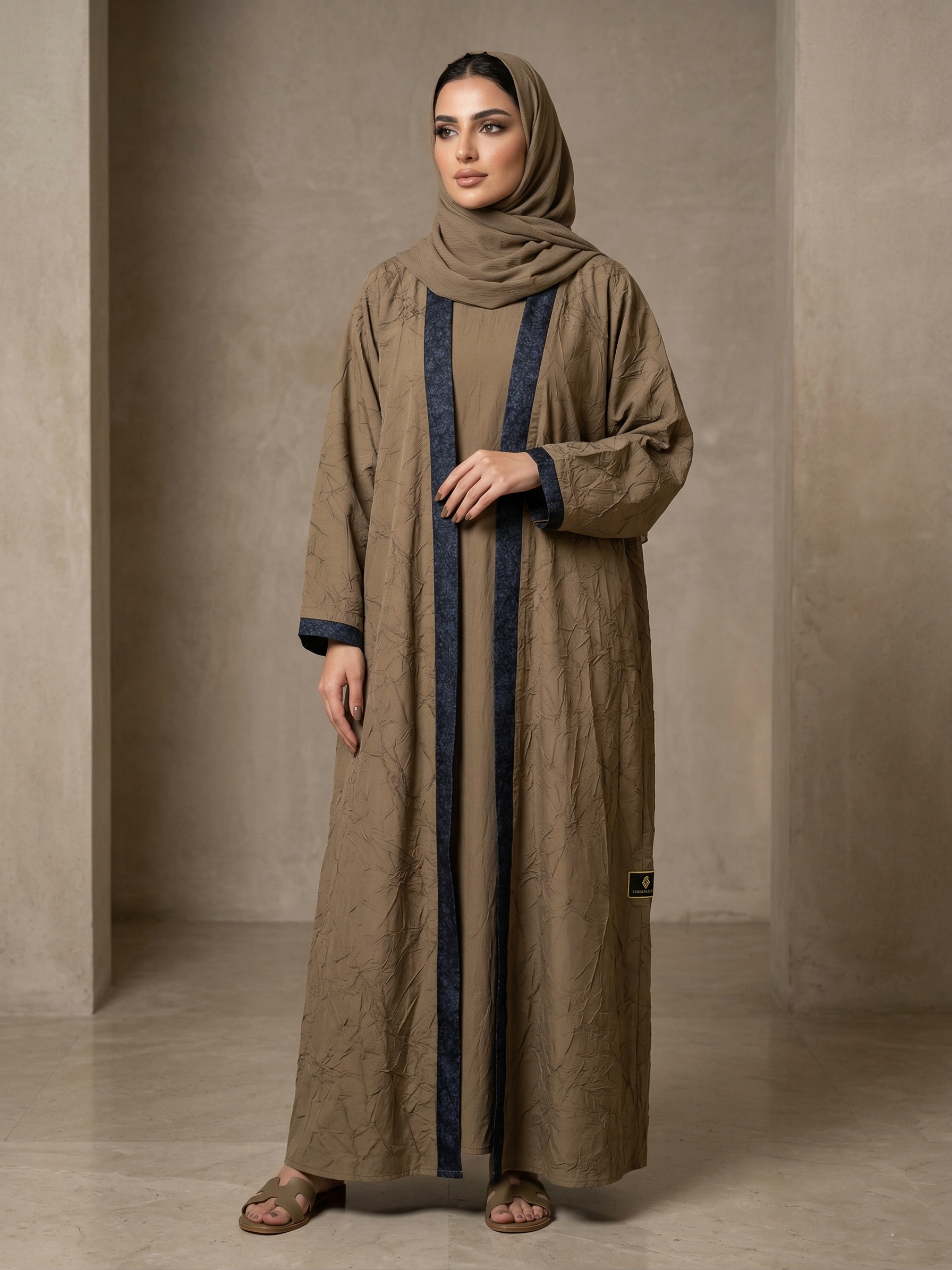 تتميز هذه العباية بخامتها الفريدة “تسلان” ذات الملمس المجعد (Crinkled) الذي يجمع بين المظهر التقني الحديث والراحة القصوى. تأتي العباية بلون ترابي دافئ يمنحكِ وقاراً طبيعياً، مع تحديد ذكي باللون الكحلي الداكن على الياقة والأكمام ليبرز تفاصيل التصميم ويضيف لمسة من التباين الجذاب.