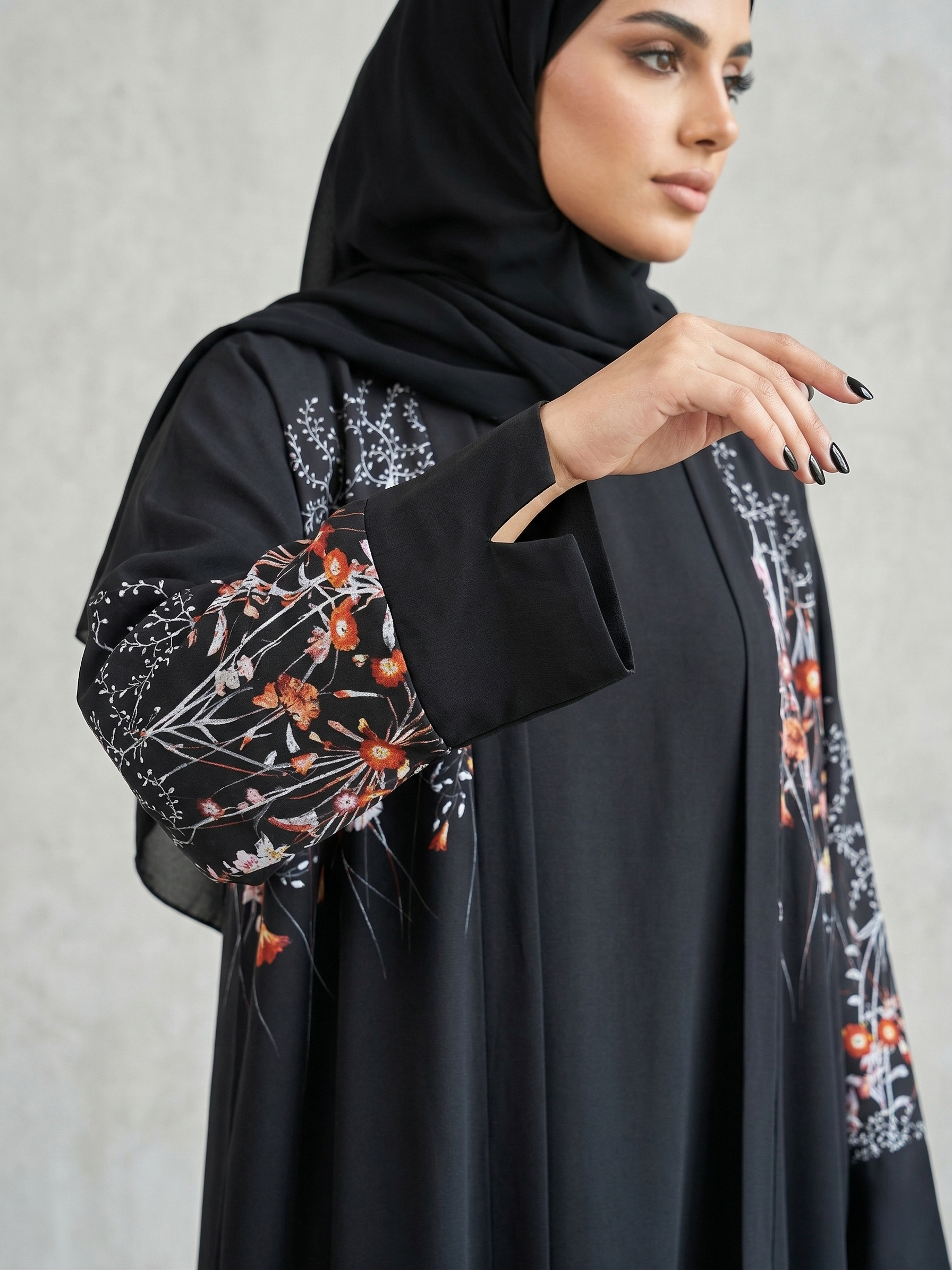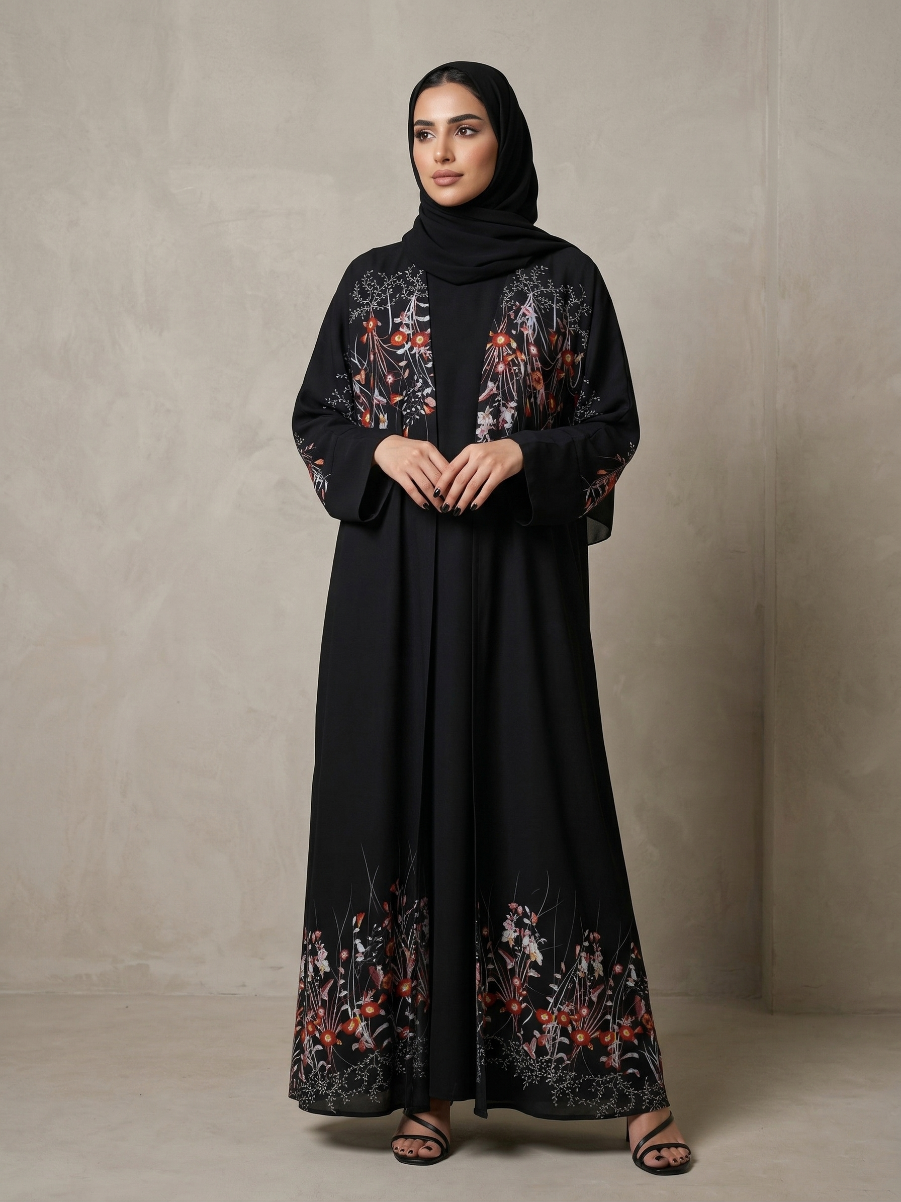 التصميم: قصة كلاسيكية مفتوحة (Open Abaya) بلمسات فنية مطرزة توحي بالفخامة والتميز.